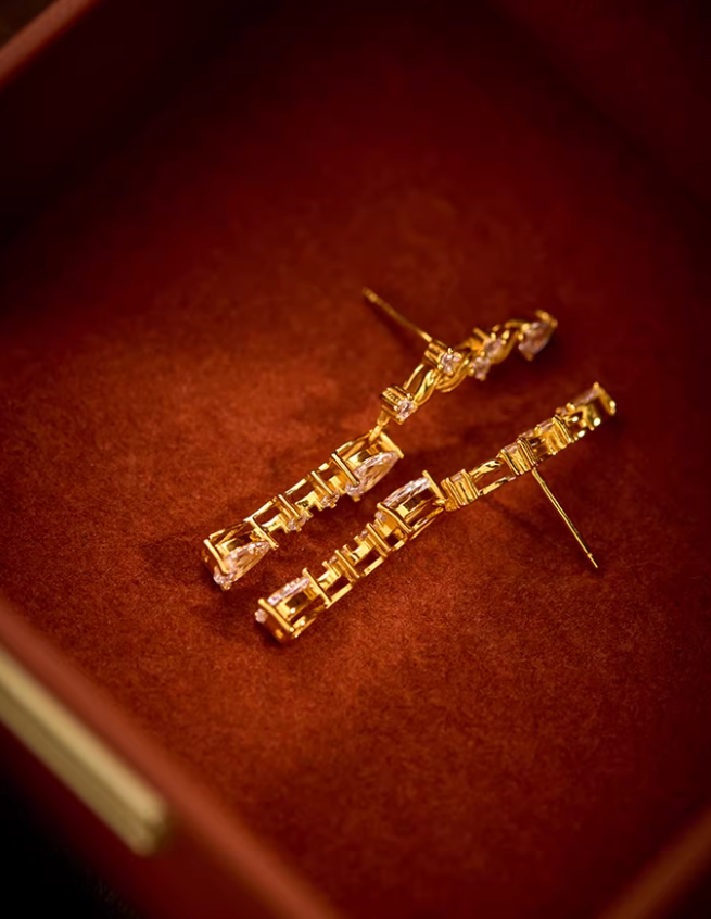 Inspired by the natural movement of flowing gold under light, these longline earrings embody a sense of graceful motion. The elongated silhouette creates a striking vertical line that enhances the neck and jawline, delivering a refined yet bold aesthetic. Perfect for those who appreciate statement jewelry with an artistic soul.